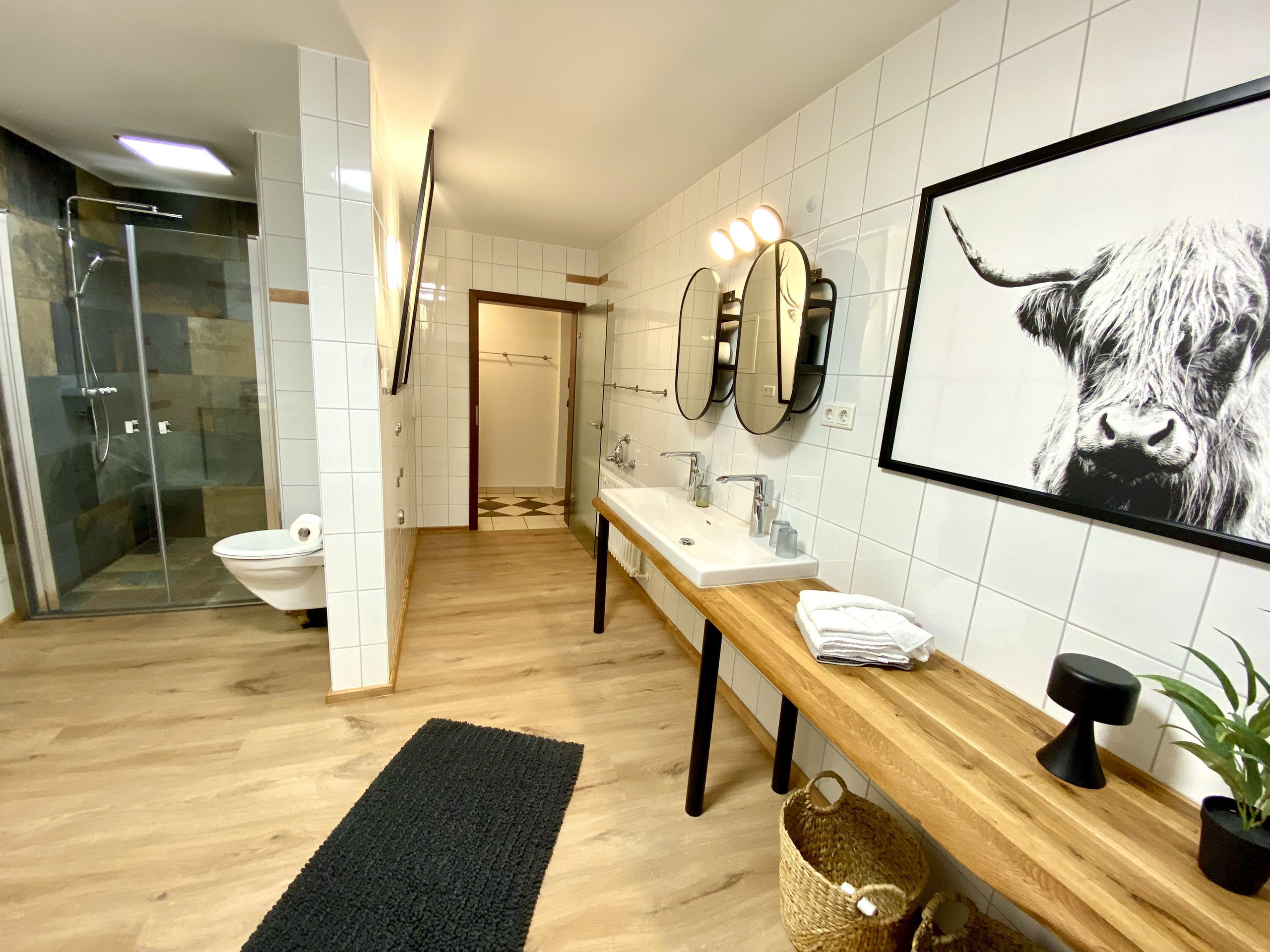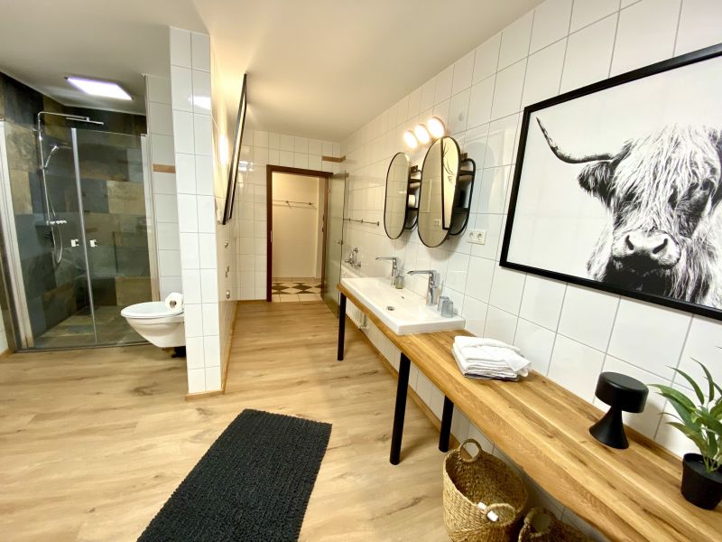 Die Parterre Wohnung in diesem Haus verfügt über 4 Schlafmöglichkeiten in zwei Schlafzimmern mit jeweils einem Doppelbett (und einem Einzelbett), die Wohnung ist erweiterbar für 6 bzw. 8 Personen mit dem Einliegerappartement im 1. OG. Die Wohnung verfügt über einen großzügigen Wohnraum mit integrierter Küche und angrenzendem Garten mit großer überdachter Terrasse. Zu dem Gäste-WC verfügt die Wohnung über ein großes Bad mit begehbarer Dusche.